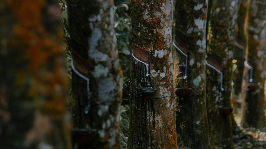 Latex is harvested by “tapping” — making a small incision in the bark to collect the milky sap. The tree is not cut down. A single Hevea brasiliensis tree can be productively tapped for 25 to 30 years before replanting, and each replanted tree begins absorbing carbon from day one.
